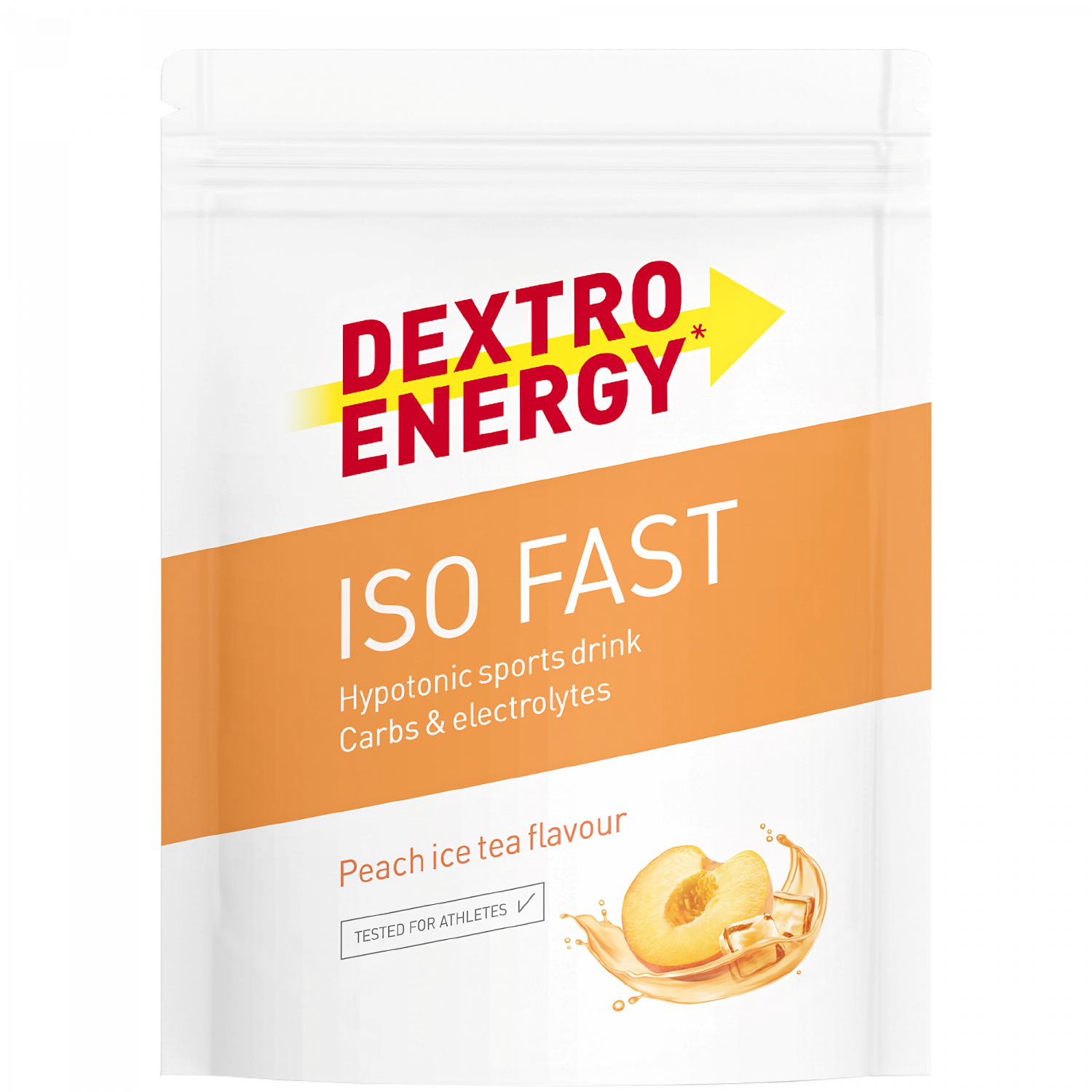 Der Dextro Energy Iso Fast Drink liefert ca. 16,4 g Kohlenhydrate pro 250 ml. Mische 56 g Pulver mit 750 ml Wasser und trinke alle 20 Minuten ca. 150 ml.